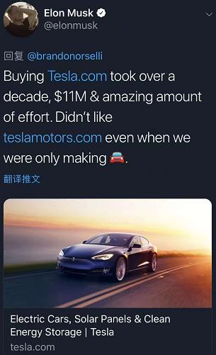 近日關于這枚域名交易的具體金額終于有了實錘!特斯拉創始人馬斯克發文透露說他花了10年以上時間和很多精力才在2016年以1千1百萬美元的價格拿下Tesla.com域名,以替換原有的TeslaMotors.com域名。