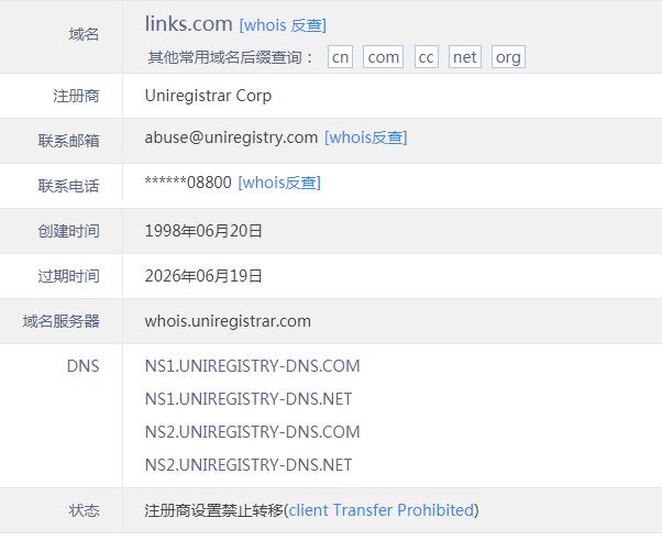查詢whois發(fā)現(xiàn),該域名注冊于1998年,距今已有21年歷史,是一枚很典型的英文單詞米,直譯為“鏈接、關(guān)系、紐帶”等,簡短好記已輸入,而且這枚域名的適用性也極廣。