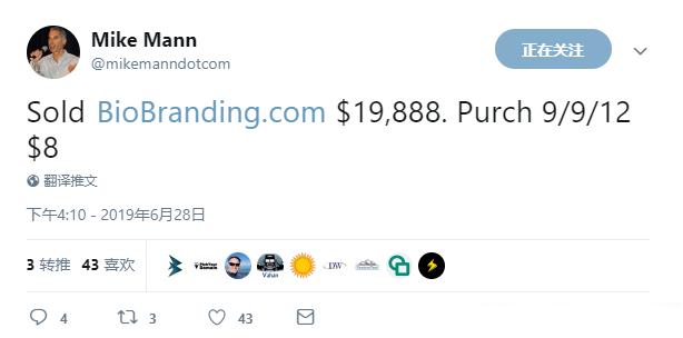 此外,海外知名投資人Mike Mann在推特上稱其以8美元注冊的域名biobranding.com以19,888美元售出,約合人民幣13.6萬元。