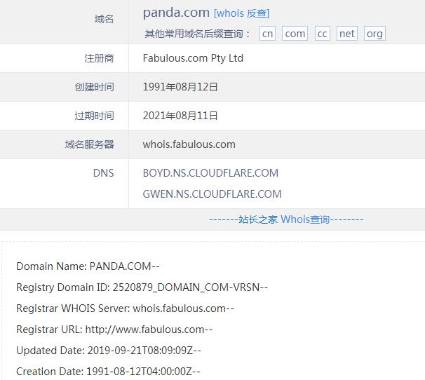 查詢whois發(fā)現(xiàn),域名panda.com注冊(cè)于1991年8月,距今有28年時(shí)間,是一枚英文動(dòng)物域名,含有“熊貓”含義,簡(jiǎn)潔好記,便于傳播且容易記憶,輸入也不容易出錯(cuò),據(jù)賣(mài)家介紹域名每月搜索量550000+、對(duì)應(yīng)所有手機(jī)上的表情符號(hào)、提供即時(shí)的品牌知名度、超稀有的單詞動(dòng)物域名。對(duì)應(yīng)的終端也是實(shí)力不菲,例如PandaDoc(pandadoc.com)、熊貓直播(panda.tv)、熊貓頻道(ipanda.com)等等。根據(jù)whois歷史記錄可知,本周panda.com從Network Solutions轉(zhuǎn)到了受隱私保護(hù)的Fabulous.com帳戶。