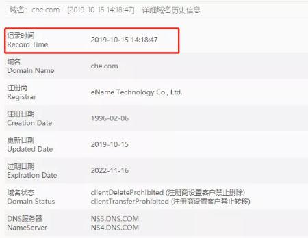 查詢whois發現,域名che.com注冊于1996年2月份,距今有23年時間,賣家是域名投資人西蒙。域名直接對應“車”,具有行業針對性,能夠囊括整個車行業,商業價值不菲,搭建車類品牌平臺再合適不過了。在國內域名市場上,像che.com等含義多樣化、組合多元化的單拼域名,市場需求十分強勁,深受域名投資者和終端的喜愛,而域名che.com指向性和針對性特別強,價值更高。