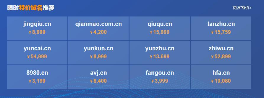 打開首頁就能看見,點(diǎn)擊更多可以查看全部【限時特價域名】推薦,以遠(yuǎn)低于原價的價格購買其中的優(yōu)質(zhì)域名。為與正常價格銷售域名做區(qū)分,每個【限時特價域名】都會在右側(cè)帶有閃電的標(biāo)志,鼠標(biāo)移上去會有特價剩余時間提示,限時特價時間為1-7天不等,時間一到立即恢復(fù)原價,歡迎大家關(guān)注。
